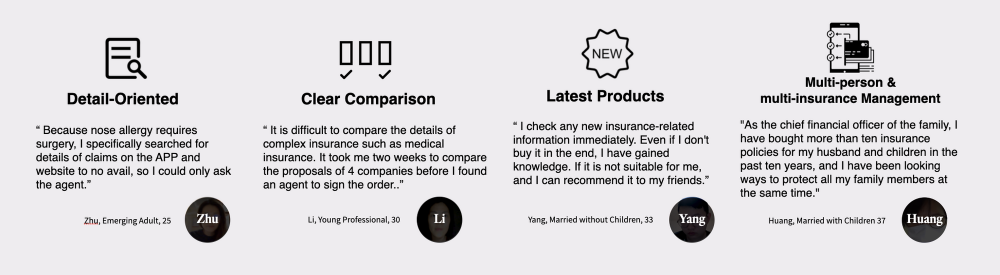 Through user interviews, UX researchers summarized that there’s 4 main types of users. Users have completely different behavioral pattern in their insurance journey. Some users are more independent in purchasing and managing insurance, while others wish to get more expert guidance in the process. Our design strategy was to target the self-guided users first because we felt they would benefit the most from the digital transformation.