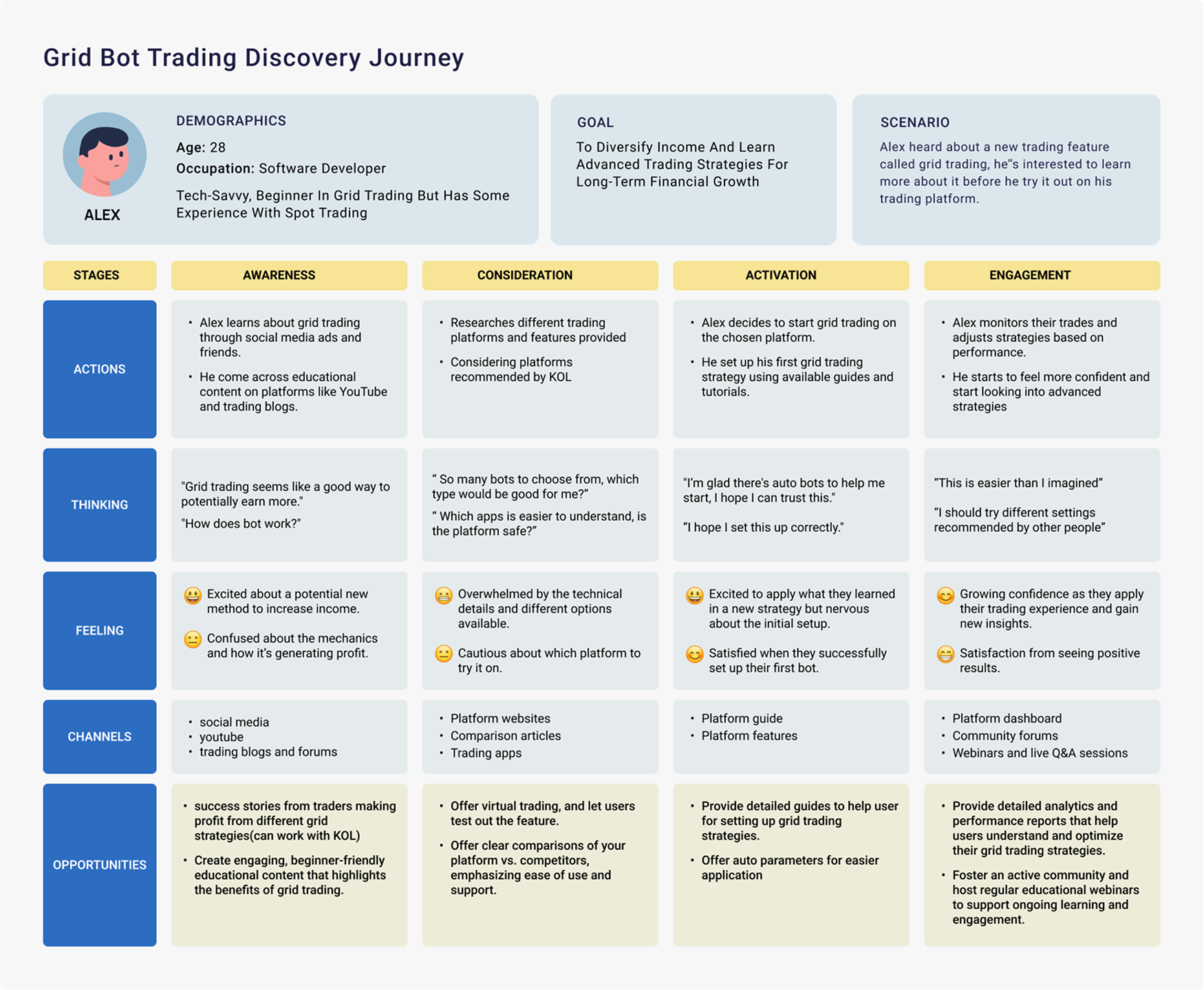 Through the journey map, we learned that getting users to try grid trading is the most difficult part, once users have the experience they’ll understand that it’s relatively easy and safe to do grid trading compared to other strategies.