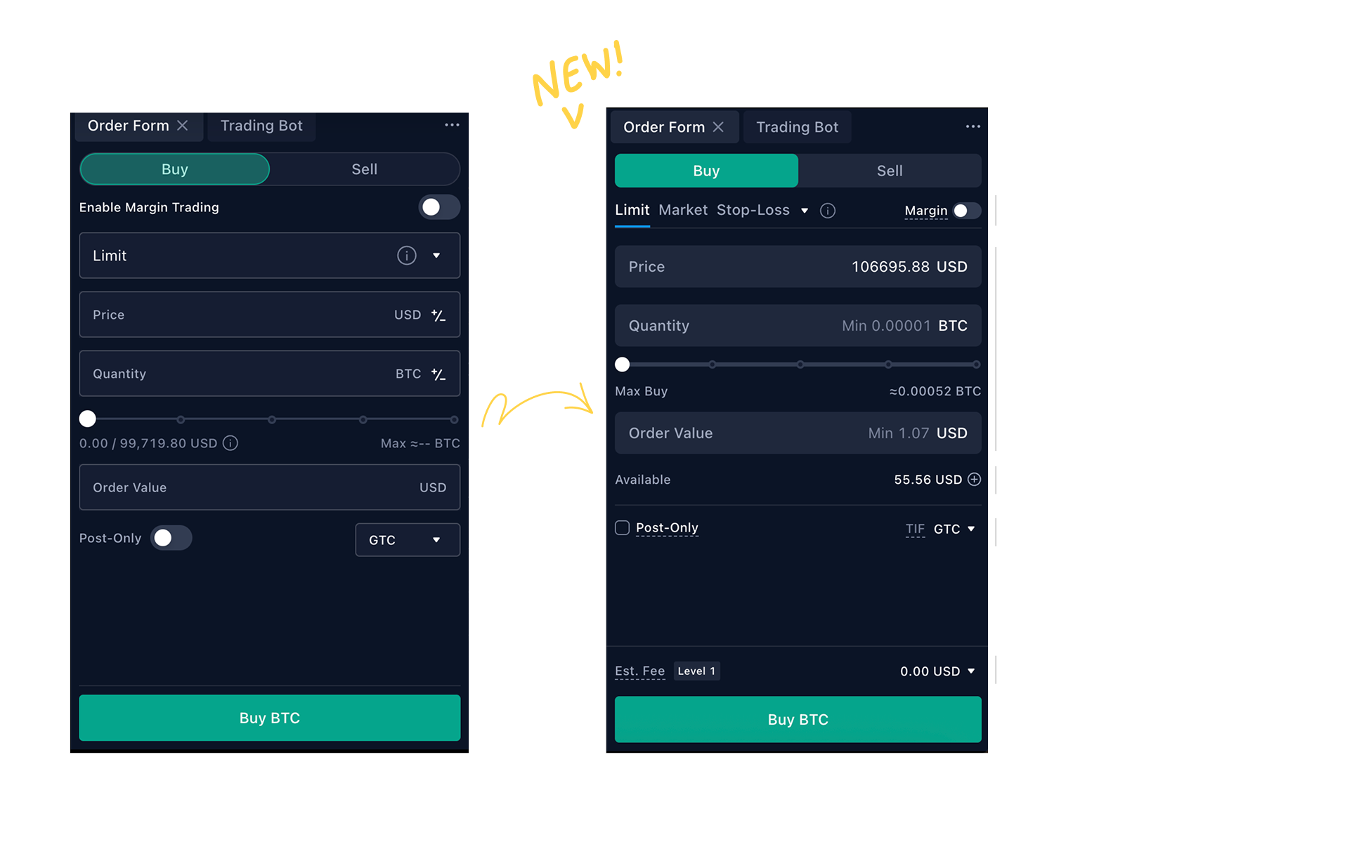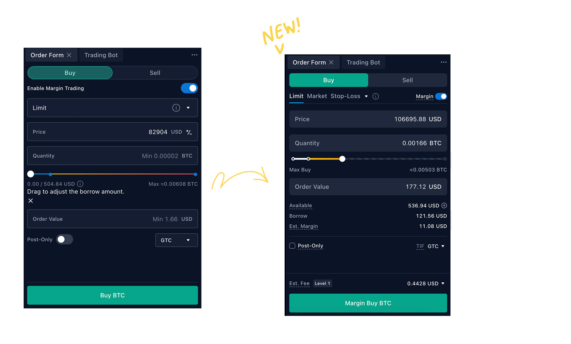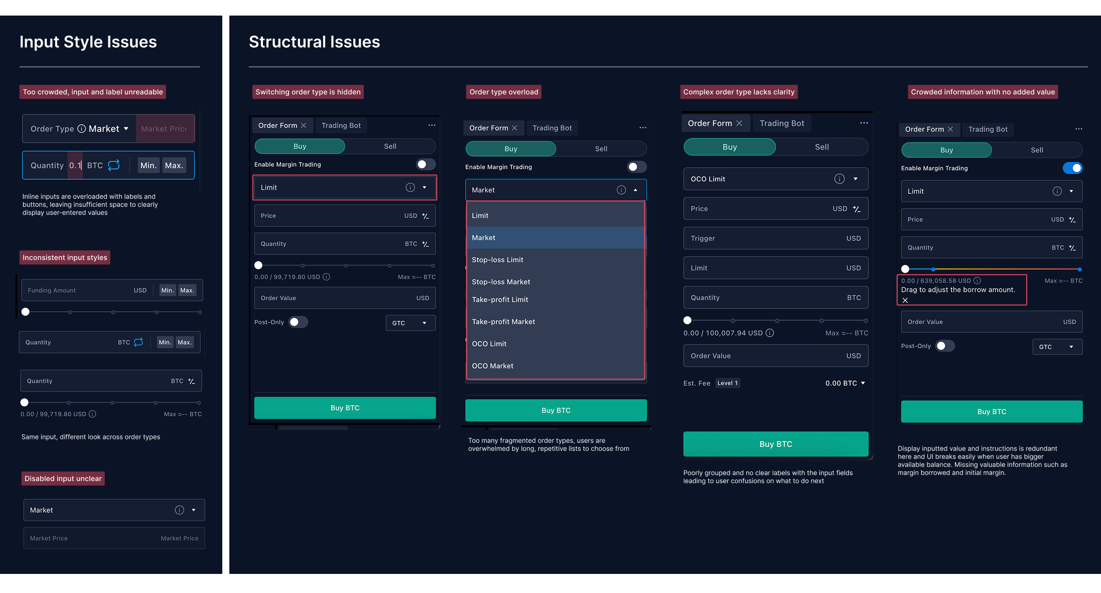 For advanced traders, efficiency is key - users often monitor charts, the order book, and place trades simultaneously. The order form redesign focuses on optimizing space with inline inputs and compact layouts, making it easier to scan and interact quickly. Components were restructured for clearer visual grouping, improving usability without sacrificing functionality.