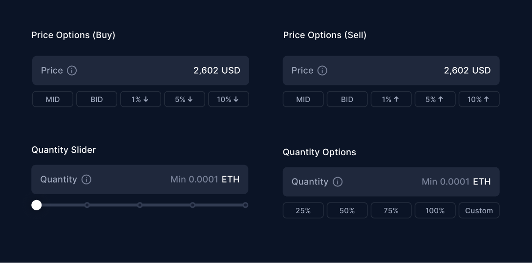 Added flexibility for users to enable quick price buttons (e.g. bid, ask), choose between slider or percentage inputs, and toggle steppers based on preference. Designed to suit both noivce and advanced traders.